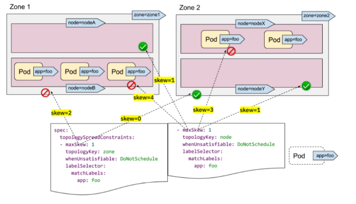 - 파드 스케줄링 당시에 모든 topology 중 매칭되는 파드의 수가 가장 적은 topology 와의 파드 수 차이가 maxSkew를 만족하는 노드를 선택해 파드 배포