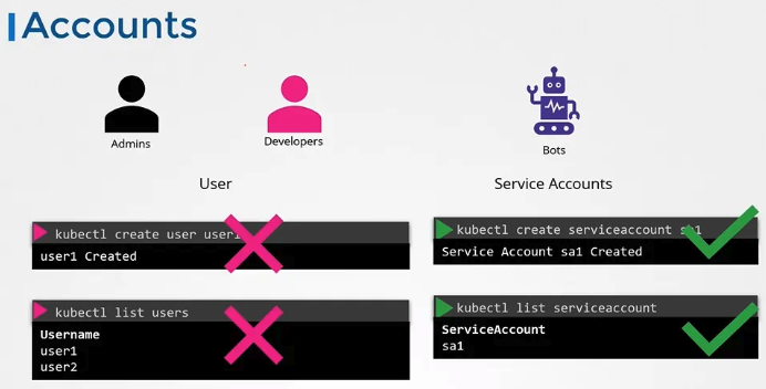 Kubernetes 자체는 사용자 계정을 직접 관리하지 않습니다. 대신, Kubernetes는 외부 인증 시스템(예: LDAP, OAuth2, 인증서, 토큰 파일)에 의존하여 사용자 인증을 처리합니다. 이 외부 시스템에서 관리되는 사용자 세부 정보를 바탕으로 Kubernetes는 API 서버를 통해 인증을 수행합니다. 따라서 Kubernetes 내에서 직접 사용자를 생성하거나 삭제하는 것이 불가능하며, 서비스 계정만 Kubernetes 내에서 관리할 수 있습니다. 서비스 계정은 애플리케이션이나 프로세스가 Kubernetes 클러스터에 접근할 수 있도록 하는 계정입니다. 이러한 서비스 계정은 Kubernetes API를 통해 생성되고 관리됩니다.